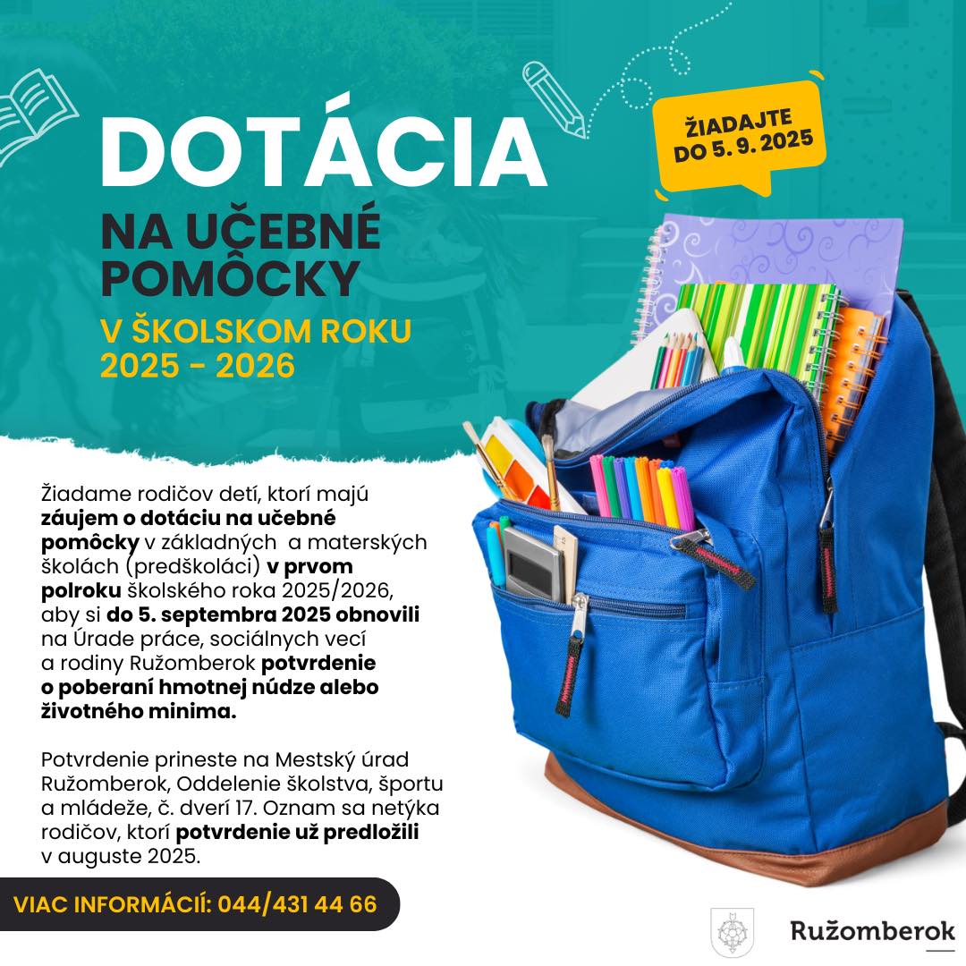 Mesto Ružomberok v spolupráci s Úradom práce, sociálnych vecí a rodiny informuje rodičov, že aj v školskom roku 2025/2026 je možné požiadať o dotáciu na učebné pomôcky pre žiakov prvých ročníkov základných škôl a predškolákov v materských školách.
