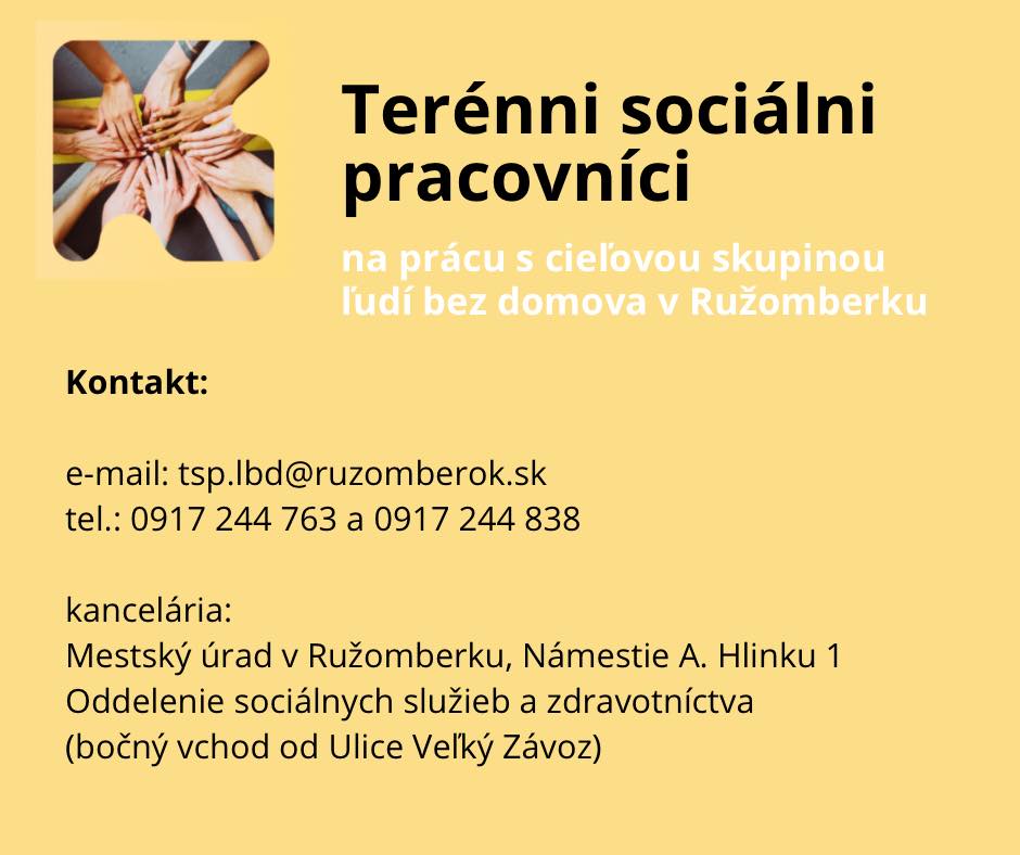 Ak viete o niekom, kto potrebuje pomoc, alebo máte otázky k tejto problematike, terénnych sociálnych pracovníkov môžete kontaktovať priamo: