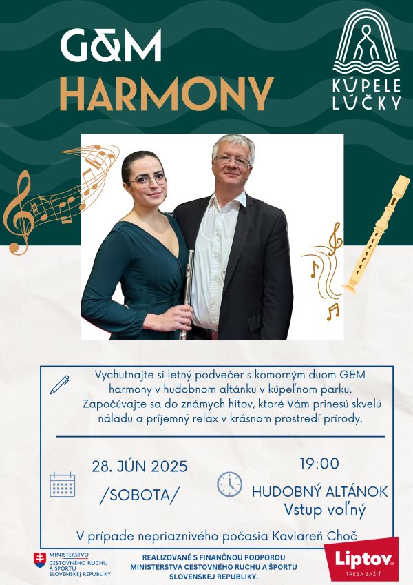 Vychutnajte si letný podvečer s komorným duom G&M Harmony. Započúvajte sa do známych hitov, ktoré vám prinesú skvelú náladu a príjemný relax v krásnom prostredí.