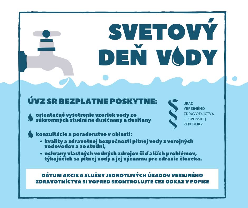 „Vo vymedzených časoch budú pracovníci všetkých RÚVZ verejnosti poskytovať odborné poradenstvo v oblasti zdravotnej bezpečnosti pitnej vody z verejných vodovodov a individuálnych vodných zdrojov, ochrany vlastných vodných zdrojov ako i ďalších problémov týkajúcich sa pitnej vody a jej významu pre zdravie človeka,“ informuje Úrad verejného zdravotníctva Slovenskej republiky.