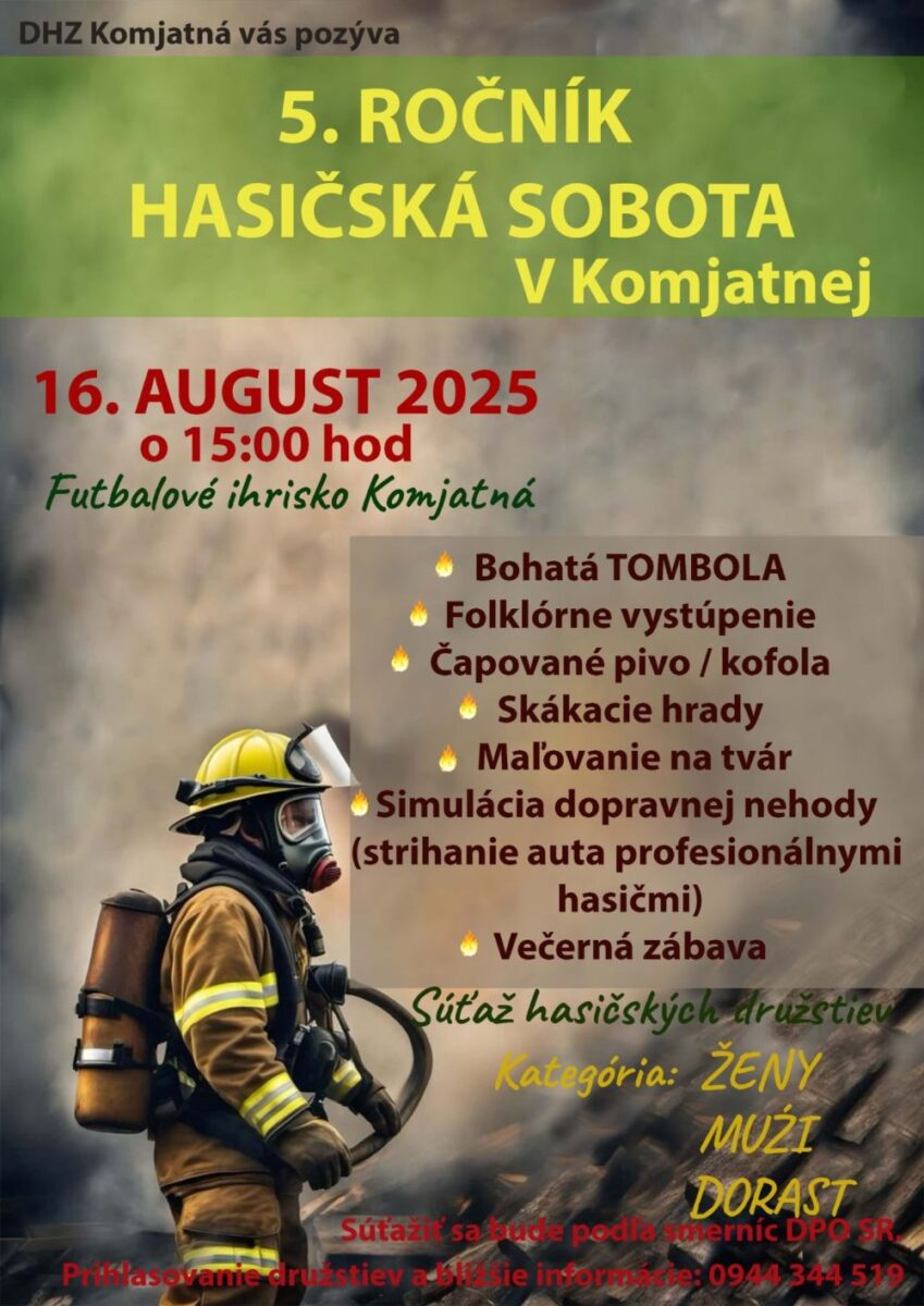 Dobrovoľný hasičský zbor Komjatná vás pozýva na V. ročník Hasičskej soboty.Tešiť sa môžete na skvelé popoludnie plné zábavy, ukážok a súťaží. Program: bohatá tombola, folklórne vystúpenie, čapované pivo / Kofola, skákacie hrady, maľovanie na tvár, simulácia dopravnej nehody (strihanie auta profesionálnymi hasičmi), večerná zábava.