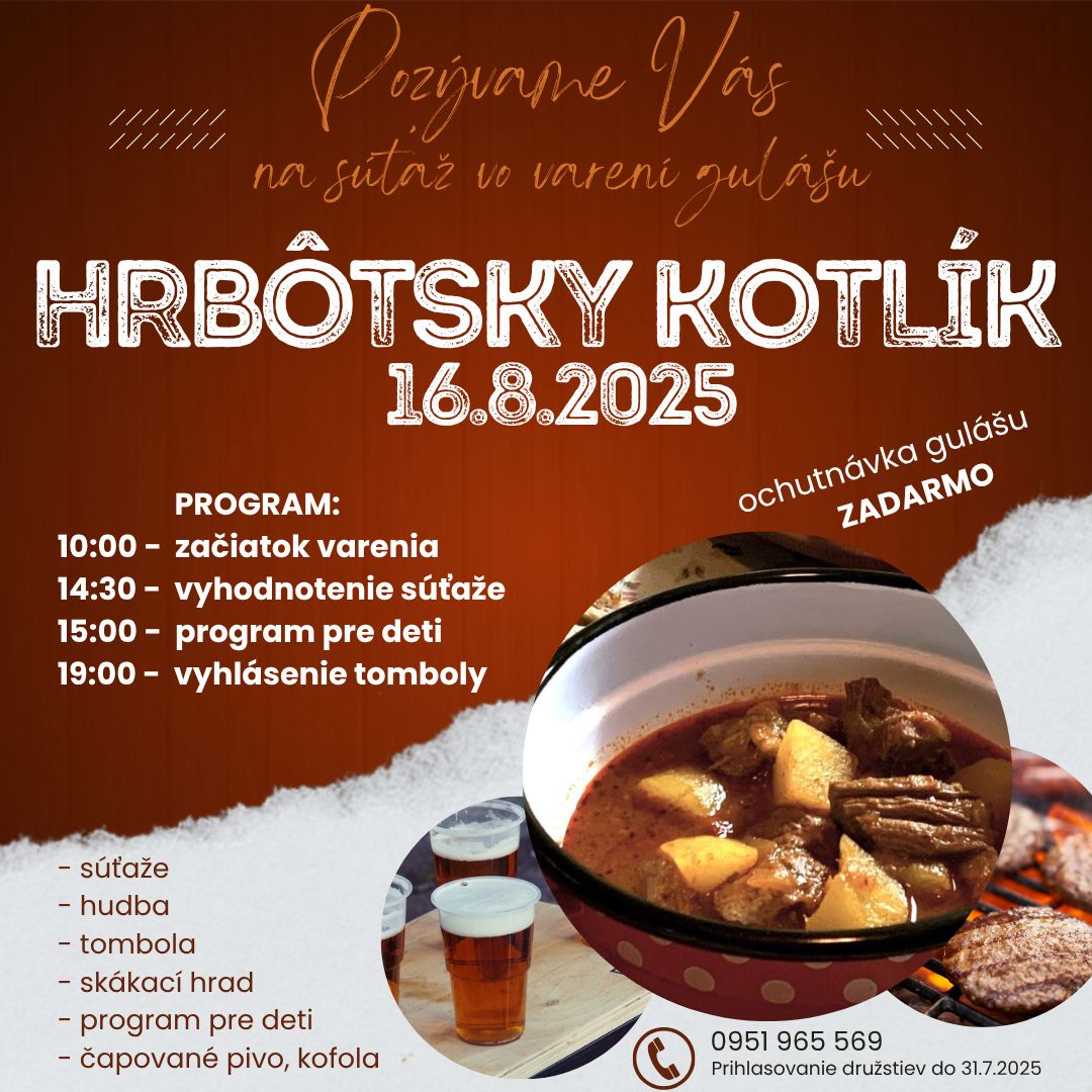 Pozývame Vás na súťaž vo varení gulášu Hrbôtsky kotlík. Tešiť sa môžete aj na: ochutnávka gulášu zadarmo, súťaže, hudba, tombola, skákací hrad, program pre deti, čapované pivo a Kofola.