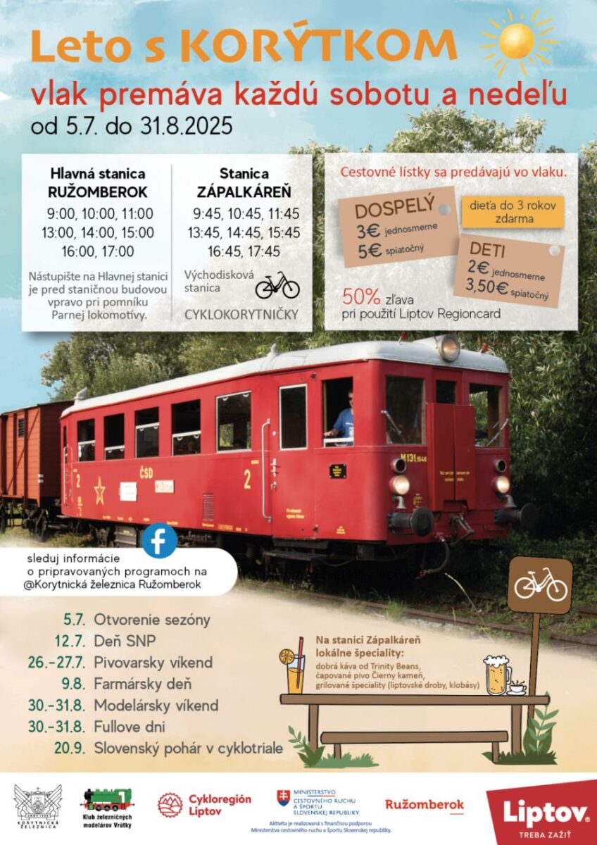 Využite jedinečnú možnosť previezť sa na vláčiku Korýtko cez mesto Ružomberok z Hlavnej stanice do stanice Zápalkáreň. Táto jedinečná trať smeruje na začiatok CykloKorytničky – obľúbenej cyklotrasy popri riečke Revúca. Vlak je pripravený aj na prevoz bicyklov a kočíkov. Nástupište na Hlavnej stanici je pred staničnou budovou vpravo pri pomníku parnej lokomotívy.