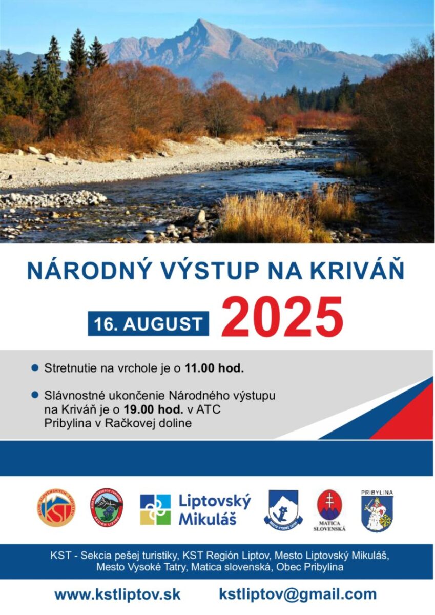 Klub slovenských turistov, Klub slovenských turistov Región Liptov, Mesto Liptovský Mikuláš, Mesto Vysoké Tatry, Obec Pribylina a Matica slovenská organizujú Národný výstup na Kriváň 2025.