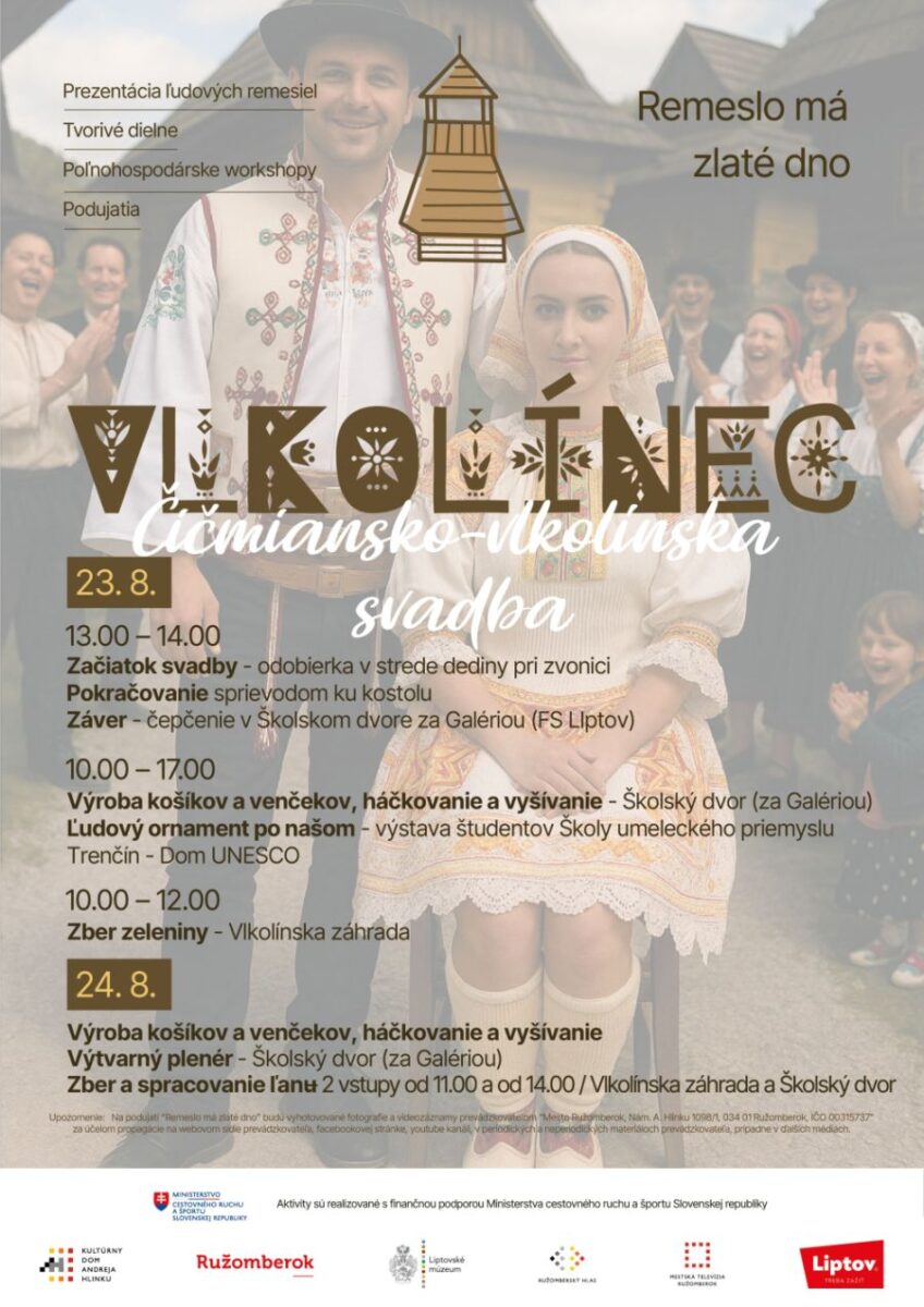 Kultúrny dom A. Hlinku vás pozýva na prezentáciu ľudových remesiel a sprievodné podujatia. Tešiť sa môžete na ukážky výroby košíkov a venčekov, háčkovania, vyšívania a výtvarný plenér v Školskom dvore vo Vlkolínci.Prísť sa môžete pozrieť aj na zber a spracovanie ľanu. Budú 2 vstupy: od 11:00 a od 14:00 hod. (Vlkolínska záhrada a Školský dvor).