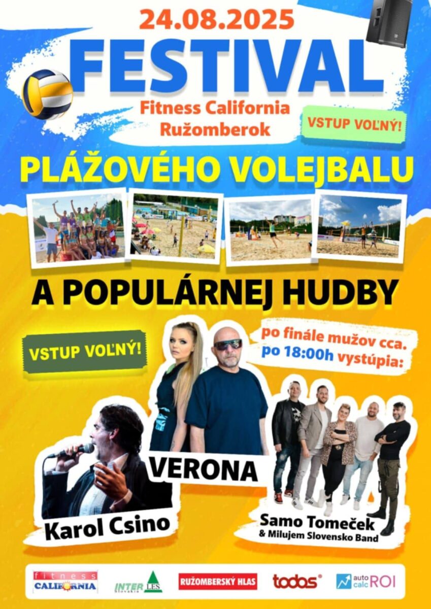 Fitness California v Ružomberku vás pozýva na Festival plážového volejbalu a populárnej hudby. Po finále volejbalového turnaja mužov cca po 18:00 sa môžete tešiť na skvelý hudobný program.