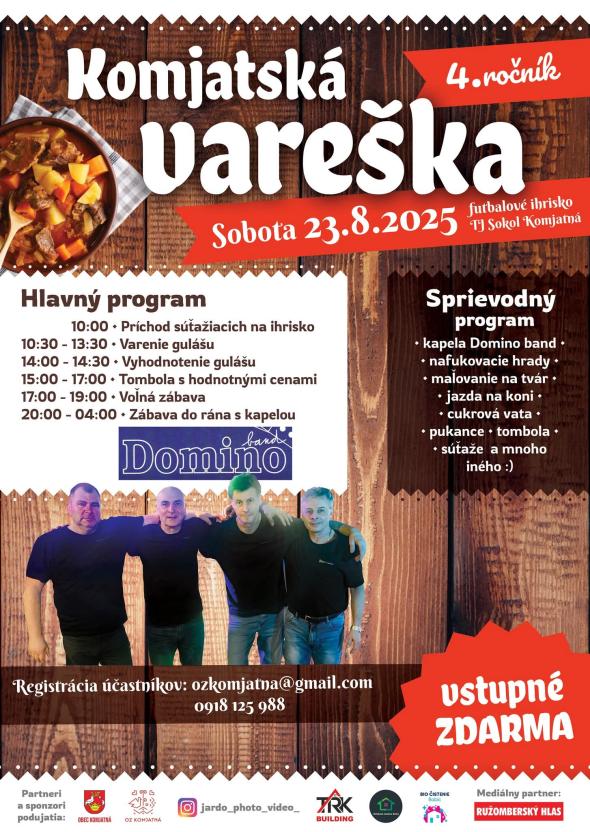 Pozývame vás na IV. ročník súťaže vo varení gulášu Komjatská vareška. Sprievodný program: nafukovacie hrady, cukrová vata, jazda na koni, súťaže, maľovanie na tvár, pukance, súťaže a mnoho iného.