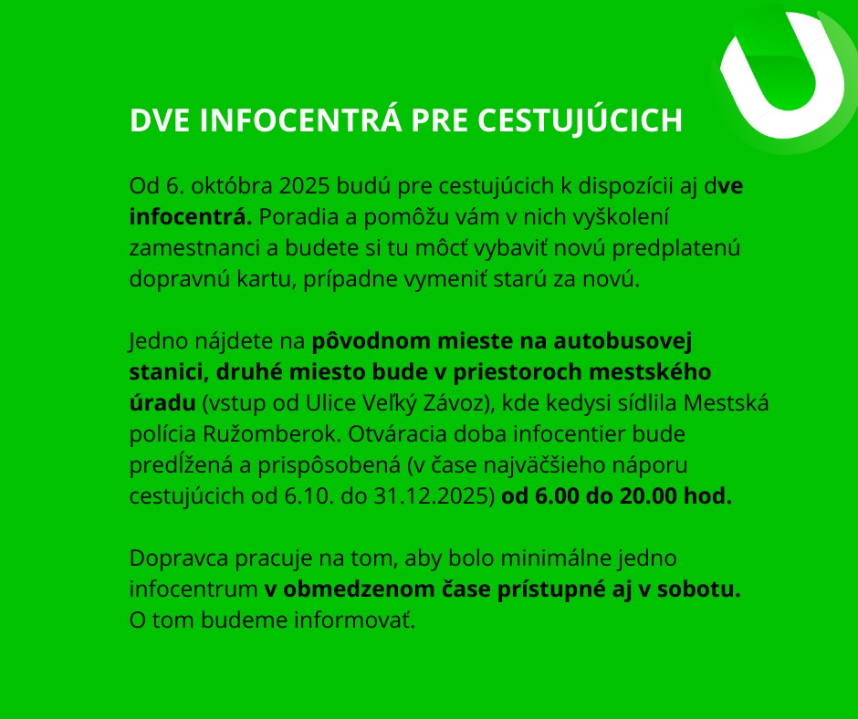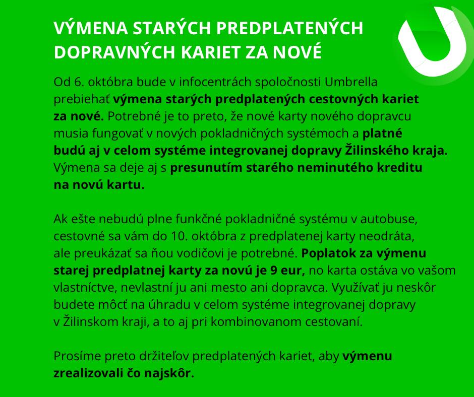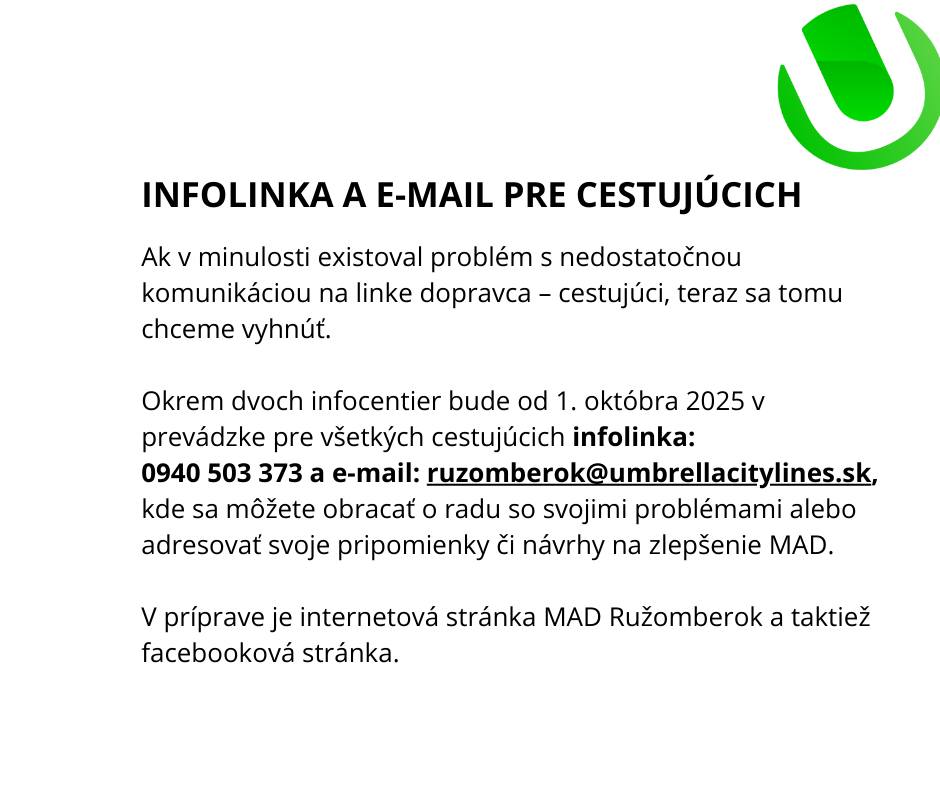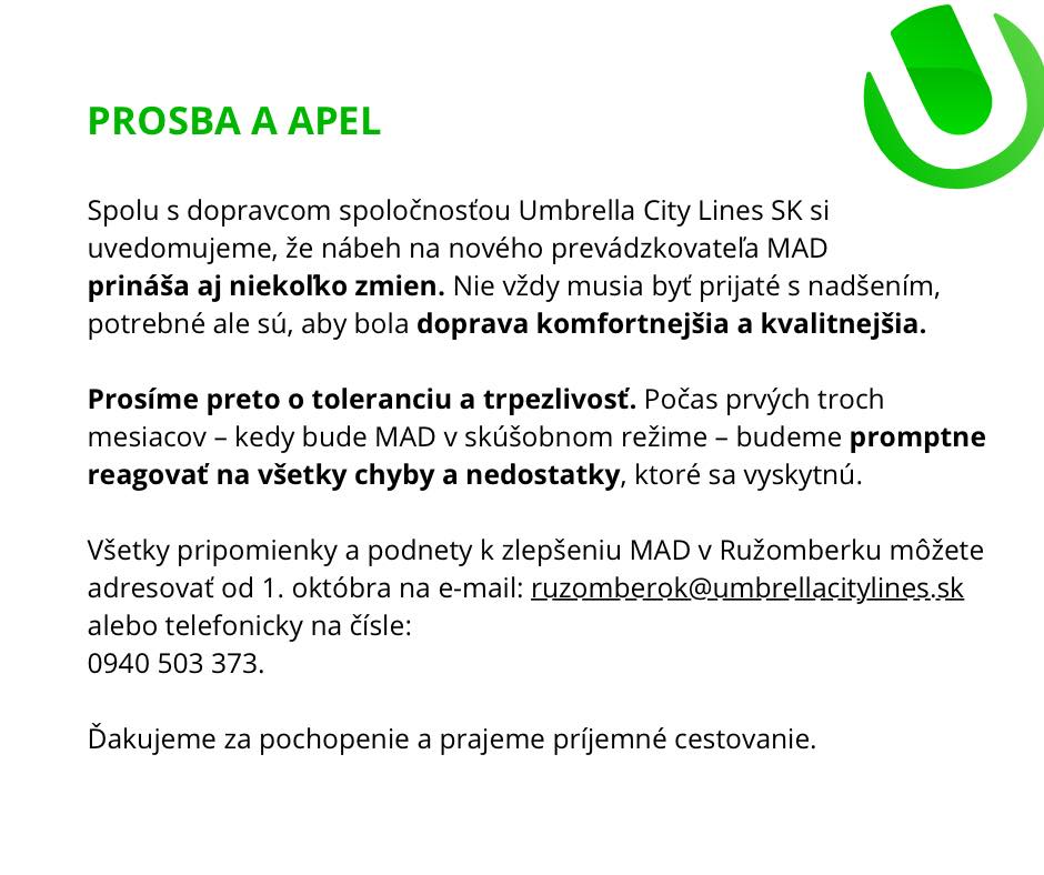 Počas nábehu môže dochádzať k menším nedostatkom. Spoločnosť Umbrella bude všetky pripomienky riešiť v skúšobnom režime prvých troch mesiacov. Vaše podnety posielajte na ruzomberok@umbrellacitylines.sk alebo sa obráťte na infolinku 0940 503 373.