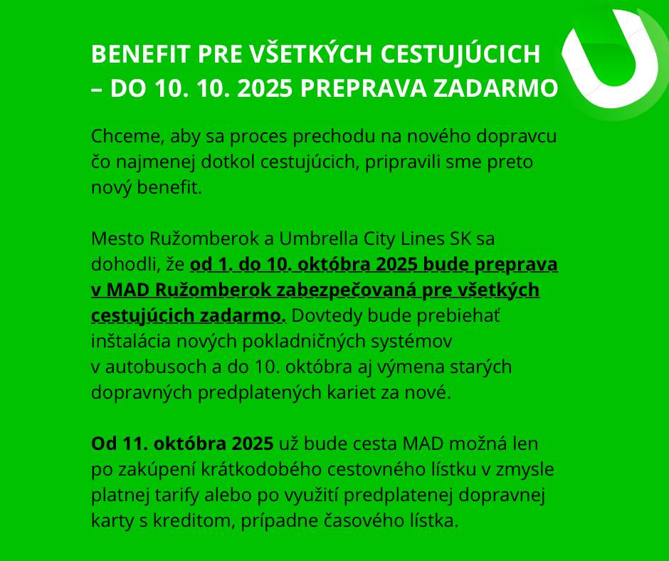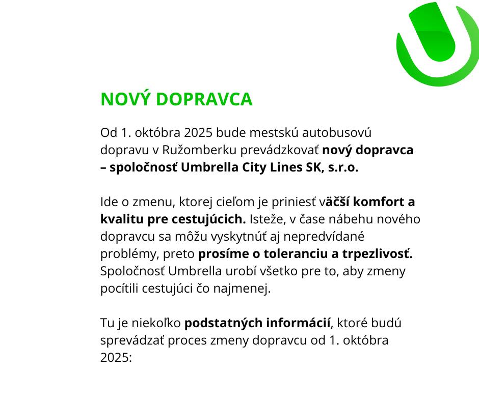 Od 1. októbra 2025 bude mestskú autobusovú dopravu (MAD) v Ružomberku zabezpečovať nový dopravca – Umbrella City Lines SK.