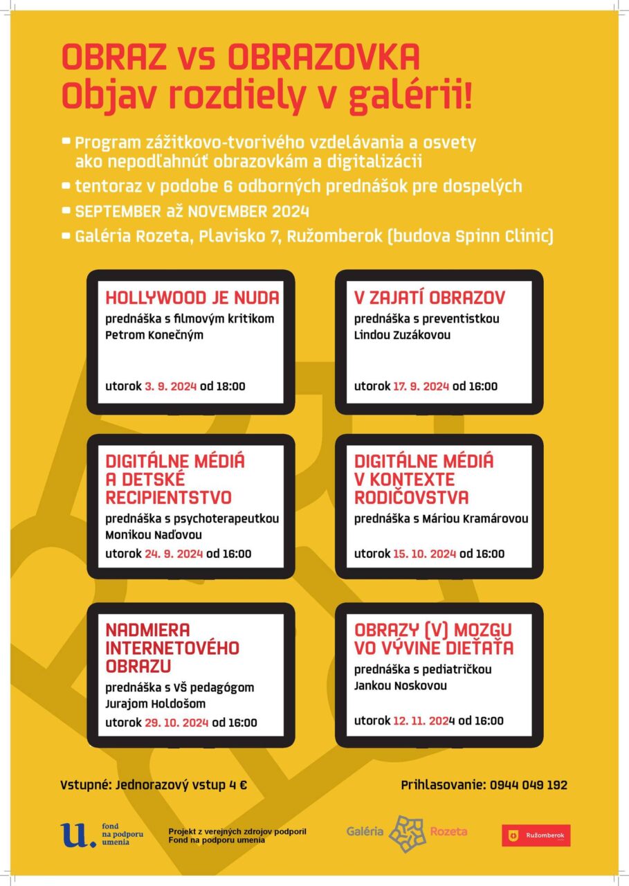 „Je dôležité nahlas rozprávať o týchto veciach aj s odbornou obcou. Náš projekt beží od mája t. r. Prednášajúci, ktorí sú experti v danej oblasti, objasňujú jednotlivé veci na základe vlastnej praxe a oficiálnych štatistík. Tiež vysvetľujú, prečo treba kontrolovať deti, aký čas strávia pred obrazovkami a aké to má potom dopady. V rámci tejto akcie sme zorganizovali aj viaceré tvorivé tvorivých workshopy pre deti," povedala pre náš portál Andrea Dobošová, ktorá tento svojim spôsobom unikátny formát v Galérii Rozeta zastrešuje.