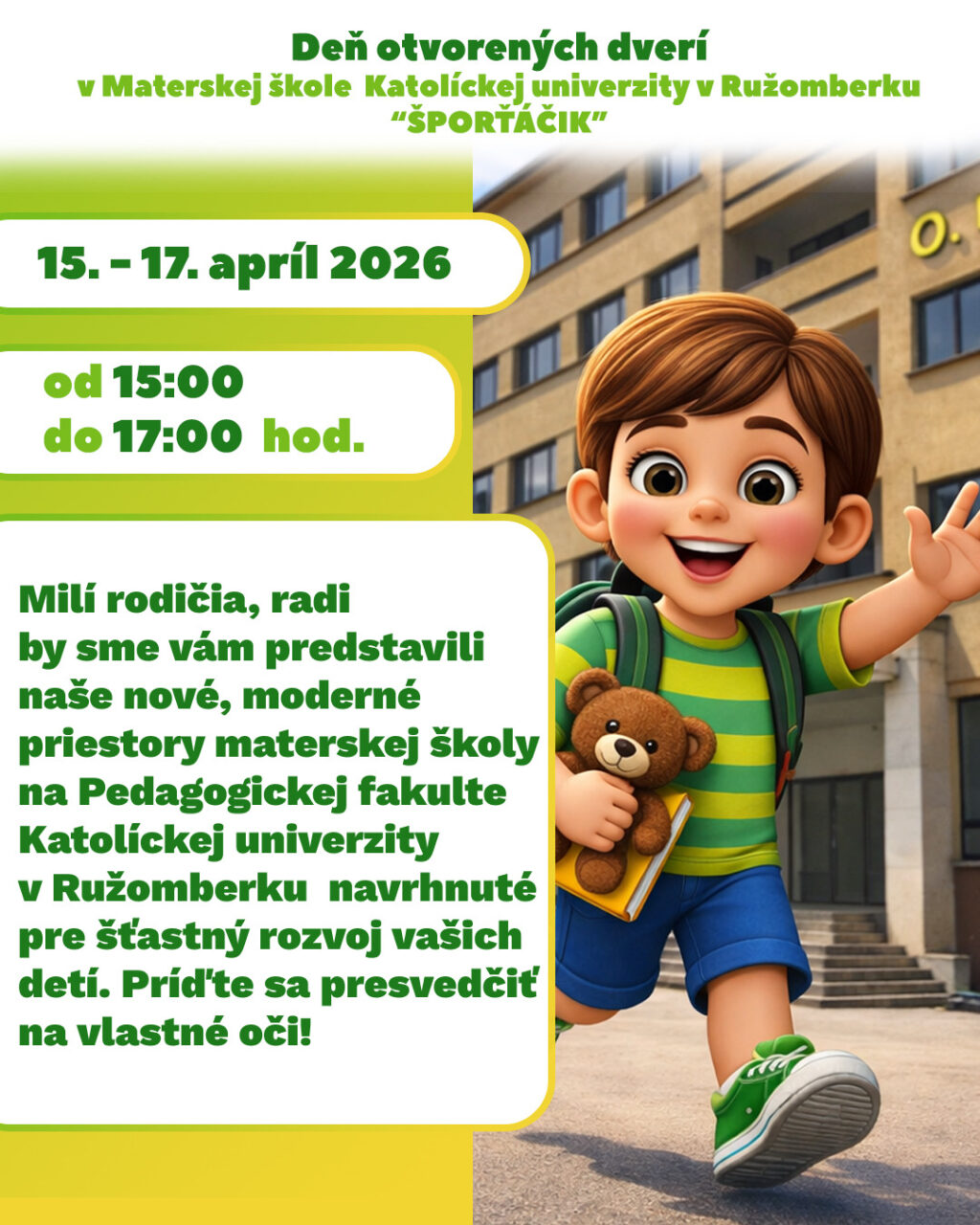 Od 1. septembra 2026 v Ružomberku pribudne ďalšia materská škola, a to na Katolíckej univerzite. Smelo možno povedať, že svojim spôsobom unikátna, s vlastným vzdelávacím programom.