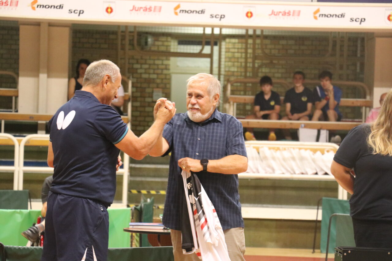 Majster Európy z roku 1974 vo dvojhre Milan Orlovski zase daroval svoj dres nestorovi ružomberského stolného tenisu Mariánovi Bystričanovi.