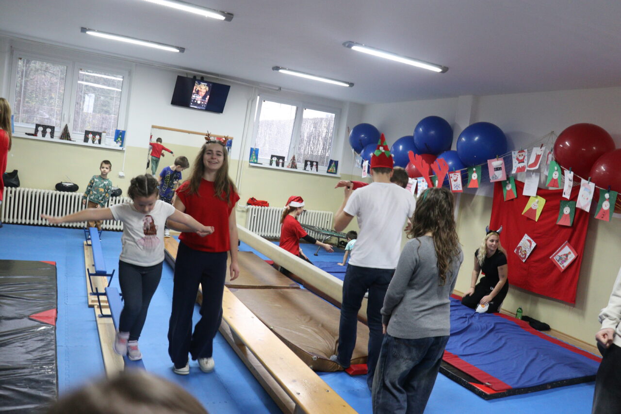 Po každej hodine prichádzali do budoby gymnázia po štyri školy a hneď sa ich ujali hostestky – študentky. Každá partia otočila štyri stanovištia, pričom všade ukrojila desať minút. „Niektoré veci sa opakujú, no tiež sa program obmieňa. Vždy súčasťou Mikulášskej akcie je gymnastika v telocvični, alebo v pohybovej miestnosti. Na chodbe mali decká vyskladanú atletickú dráhu a zo športových hier bol to florbal a basketbal,“ objasňovala ponuku aktivít Bogniarová.