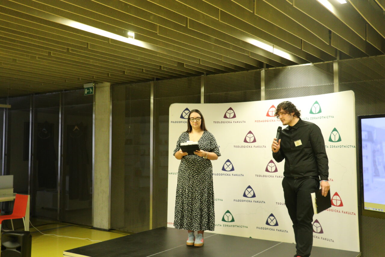 Na prízemí Univerzitnej knižnicu, ktoré ovládla predovšetkým omladina zo stredných škôl a praskalo doslova vo švíkoch, moderátorskú taktovku si do svojich rúk zobrali samotní študenti, z Filozofickej fakulty, budúci žurnalisti Alexandra Kavčiariková a Jozef Puk.