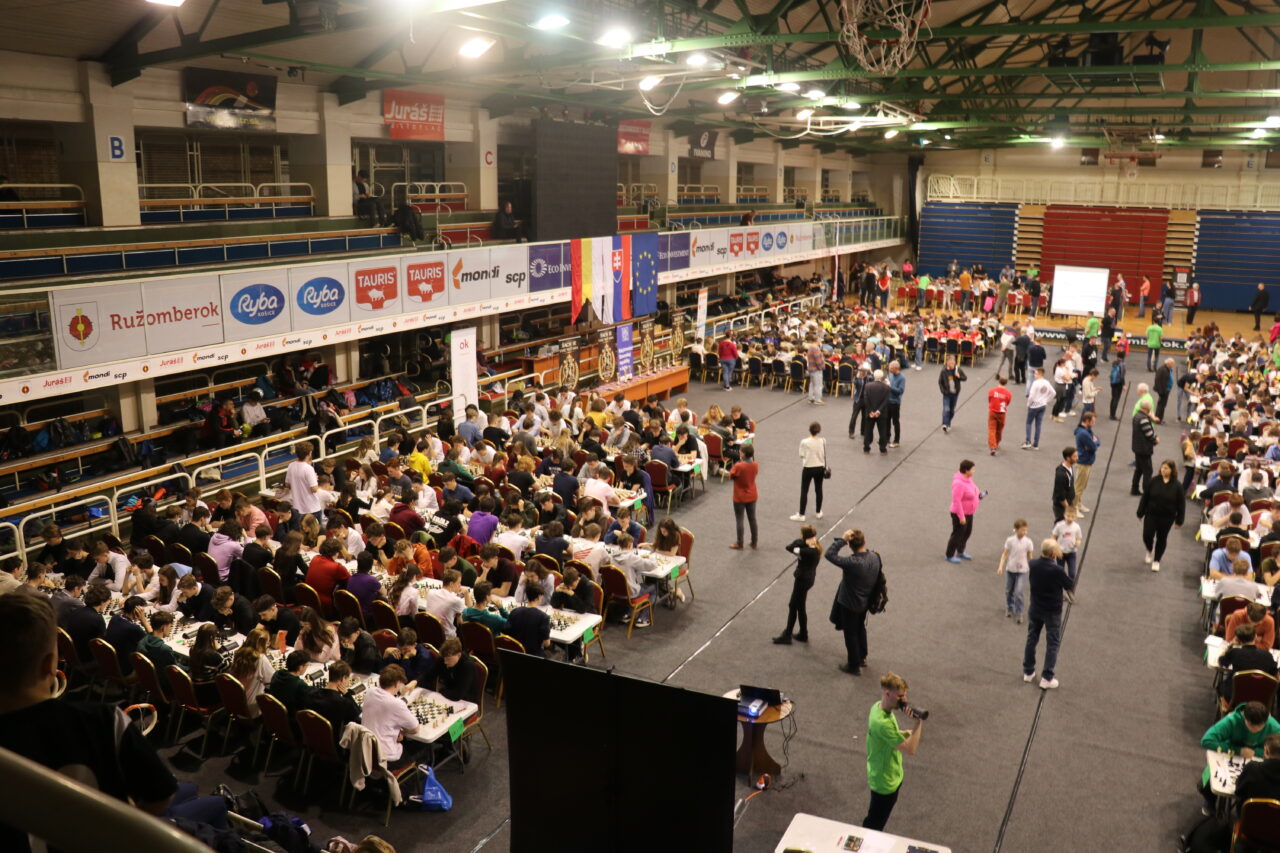 Basketbalový stánok doslova ovládla kráľovská hra. Celá palubovku bola zaplnená. „So stolmi nebol problém, je tu firma, ktorá ich prenajíma. Avšak šachovnice a hodiny sme sťahovali z celého Slovenska, od Bratislavy až po Starú Ľubovňu. Tak sa dalo dokopy 330 súprav. Našich vlastných máme okolo štyridsať, čo by nestačilo ani pre jednu najmladšiu kategóriu. Deň predtým sme si halu pripravovali do hlbokej polnoci,“ vravel ďalej M. Zelnický a dodal: „Teší ma, že zastúpenie majú takmer všetky ružomberské školy. Je to aj výsledok našej práce s mládežou.“